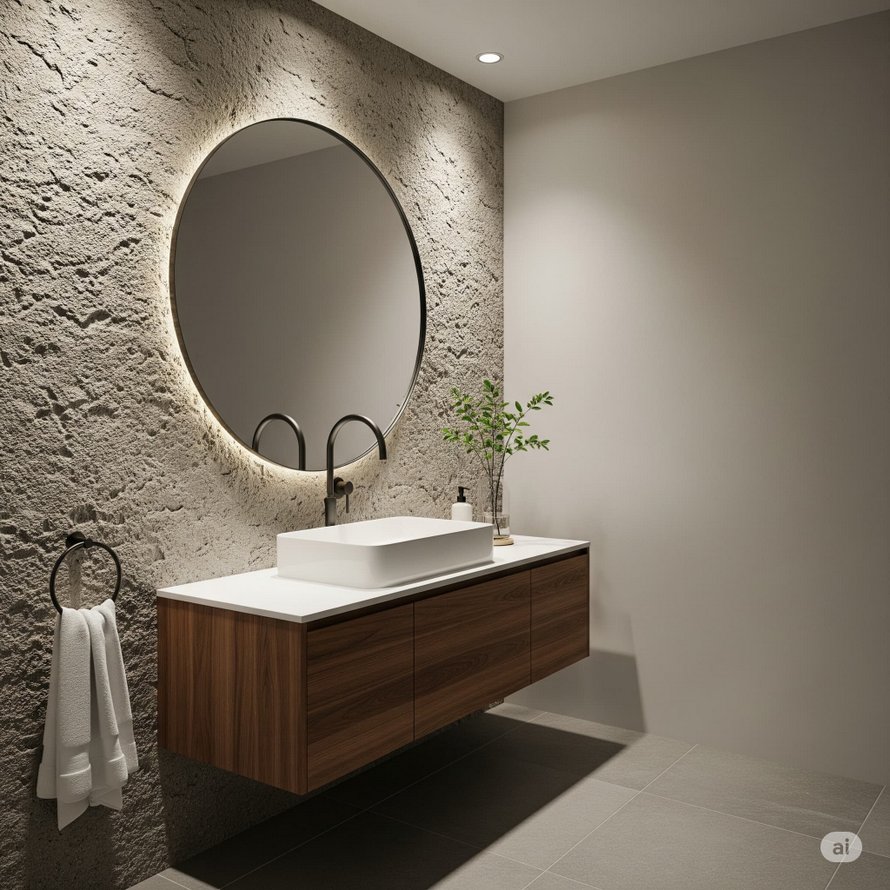 - Mikrozement: Eine sehr robuste Option. Dieser feine Zementputz wird in mehreren dünnen Schichten aufgetragen und anschließend versiegelt. Das Ergebnis ist eine moderne Betonoptik, die in vielen Farben erhältlich ist. Mikrozement eignet sich für Wände, Böden und ist sogar für die Gestaltung des Waschtischs eignet.