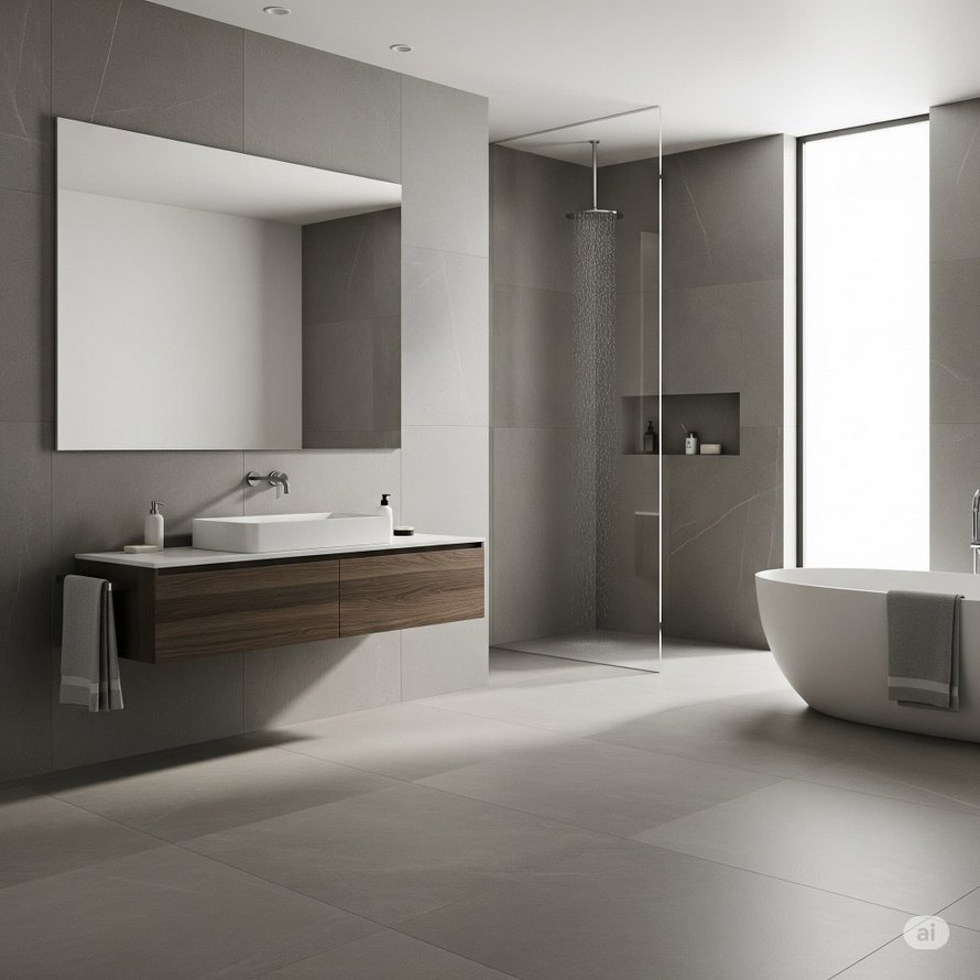 Eine weitere Möglichkeit besteht darin, die Wände mit großen, fugenarmen Platten zu verkleiden. Dies reduziert die Anzahl der Fugen auf ein absolutes Minimum.